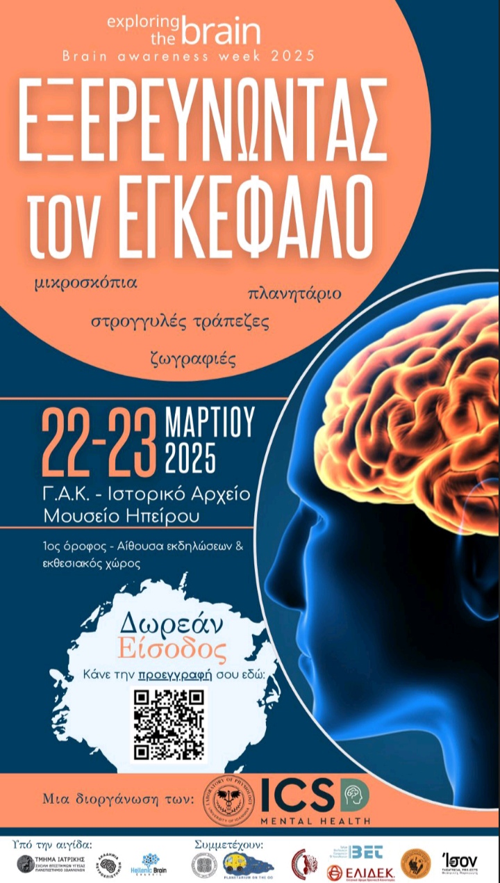 Στο πλαίσιο της διεθνούς Εβδομάδας Ενημέρωσης για τον Εγκέφαλο (Brain Awareness Week) το Εργαστήριο Φυσιολογίας της Ιατρικής του Πανεπιστημίου Ιωαννίνων και το Διεθνές Κέντρο Για Τη Βιώσιμη Ανάπτυξη, διοργανώνουν την εκδήλωση κοινού “Εξερευνώντας τον Εγκέφαλο” στην Αίθουσα Εκδηλώσεων των Γενικών Αρχείων του Κράτους, στα Ιωάννινα, στις 22 και 23 Μαρτίου 2025, σε συνεργασία με τη Νευρολογική Κλινική, τη Σχολή Καλών Τεχνών, το Τμήμα Βιολογικών Εφαρμογών και Τεχνολογιών, το Παιδαγωγικό Τμήμα Δημοτικής Εκπαίδευσης και το Τμήμα Μηχανικών Ηλεκτρονικών Υπολογιστών και Πληροφορικής, υπό την αιγίδα του Τμήματος Ιατρικής, της Ακαδημίας Νευροεπιστημών και του Ελληνικού Συμβουλίου για τον Εγκέφαλο.