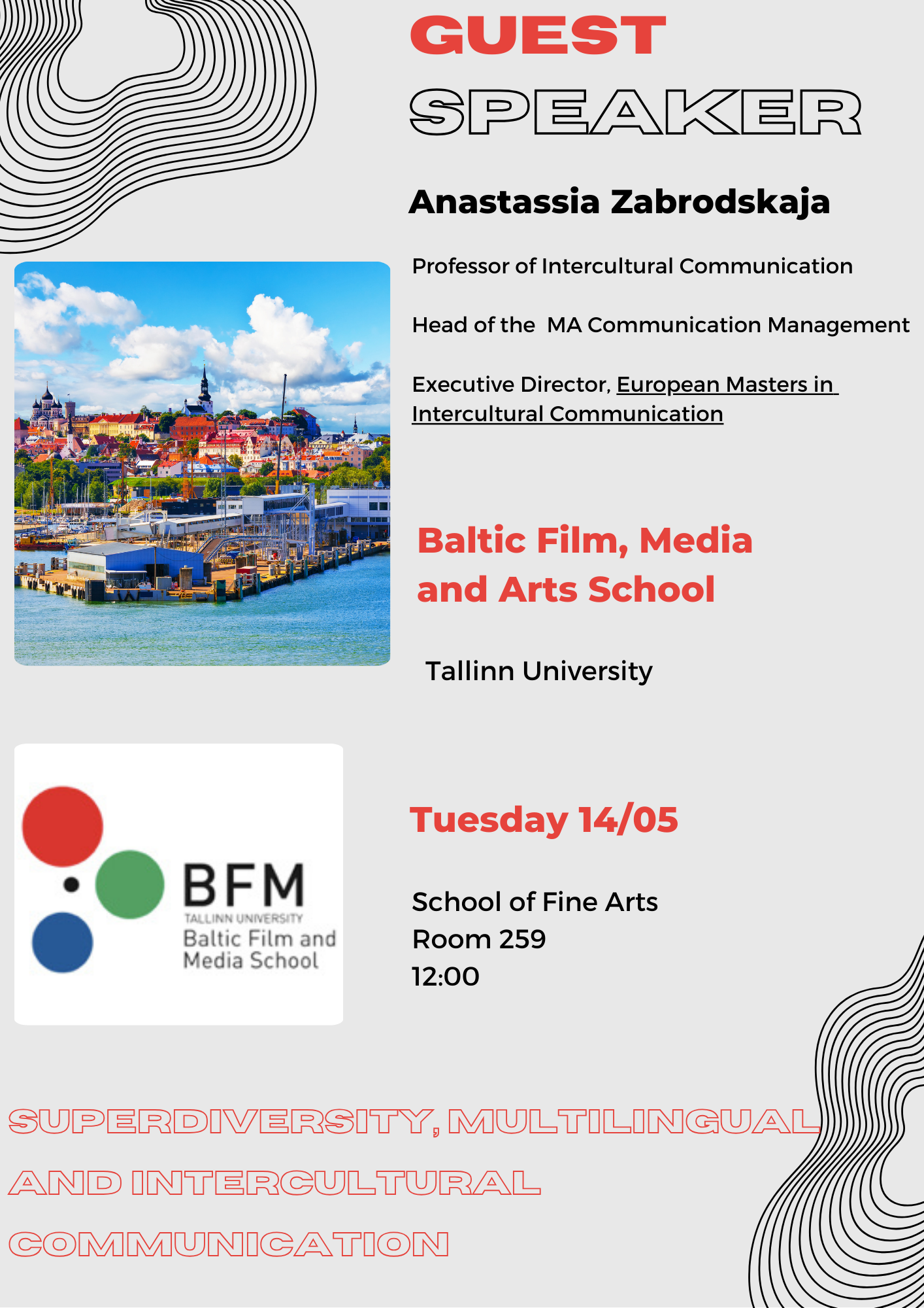 Την Τρίτη 14/05 και ώρα 12 (αίθουσα 259) θα έχουμε τη χαρά να φιλοξενήσουμε την Anastassia Zabrodskaja (Tallinn University Baltic Film, Media and Arts School). Η διάλεξή της έχει τίτλο: “Superdiversity, Multilingual and Intercultural Communication”.