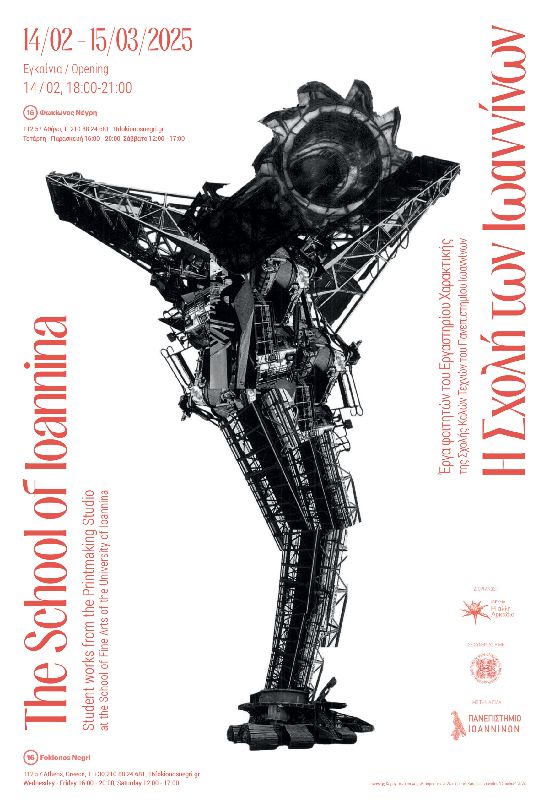Το Ίδρυμα «Η άλλη Αρκαδία» και το Εργαστήριο Χαρακτικής της Σχολής Καλών Τεχνών του Πανεπιστημίου Ιωαννίνων παρουσιάζουν στο χώρο «16 Φωκίωνος Νέγρη» από τις 14 Φεβρουαρίου έως τις 15 Μαρτίου 2025, την έκθεση «Η Σχολή των Ιωαννίνων», σε επιμέλεια του ζωγράφου και επίκουρου καθηγητή του τμήματος Εικαστικών Τεχνών και Επιστημών της Τέχνης του Πανεπιστημίου Ιωαννίνων, Κωνσταντίνου Παπαμιχαλόπουλου. Η έκθεση τελεί υπό την αιγίδα του Πανεπιστημίου Ιωαννίνων, στο πλαίσιο των εορτασμών για τα 60 χρόνια από την ίδρυσή του.