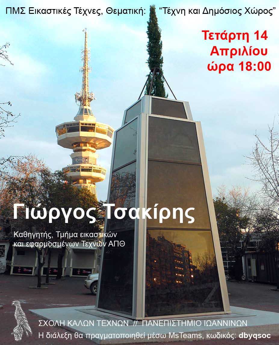 Γιώργος Τσακίρης \\ “τέχνη και δημόσιος χώρος” This event has expired Γιώργος Τσακίρης Καθηγητής, Τμήμα Εικαστικών και Εφαρμοσμένων Τεχνών ΑΠΘ Τετάρτη 14 Απριλίου, ώρα 18:00 Microsoft Teams meeting: Click here to join the meeting Start Time 18:00 14 Απριλίου 2021 Finish Time 21:00 14 Απριλίου 2021 Address διαδικτυακά μέσω MS Teams Event Participants Μπήτσικας Ξενοφών Ζωγραφική Share: