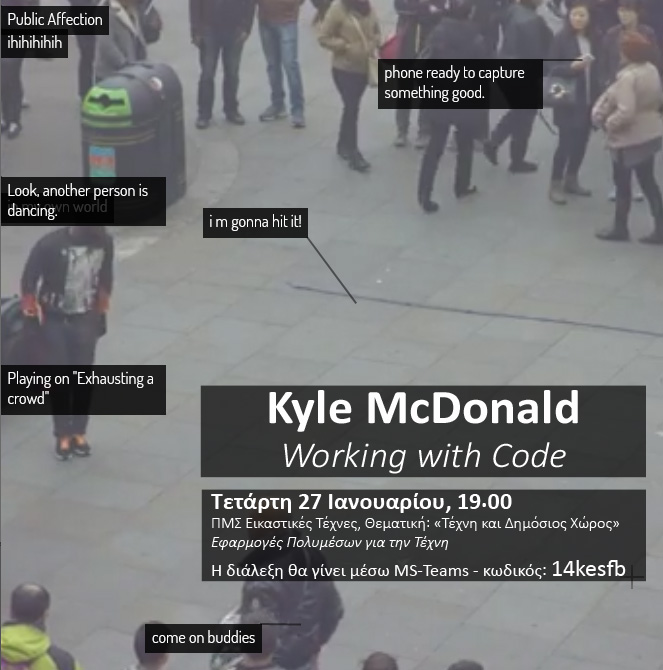 Ο Kyle McDonald θα δώσει ομιλία στο πλαίσιο του μαθήματος «Εφαρμογές Πολυμέσων για την Τέχνη» του ΜΠΣ Εικαστικές Τέχνες του Τμήματος Εικαστικών Τεχνών και Επιστημών της Τέχνης. Η ομιλία θα πραγματοποιηθεί την Τετάρτη 27 Ιανουαρίου στις 19.00 με χρήση του MS-Teams. Ο κωδικός για σύνδεση στην ομάδα της ομιλίας είναι 14kesfb ή μπορείτε να ακολουθήσετε απευθείας τον σύνδεσμο εδώ.