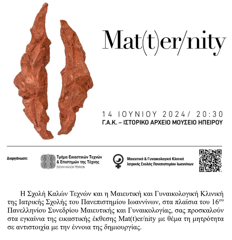 Το Τμήμα Εικαστικών Τεχνών και Επιστημών της Τέχνης της Σχολής Καλών Τεχνών και η Μαιευτική και Γυναικολογική Κλινική της Ιατρικής Σχολής του Πανεπιστημίου Ιωαννίνων, παρουσιάζουν την εικαστική έκθεση με τίτλο Mat(t)er/nity.