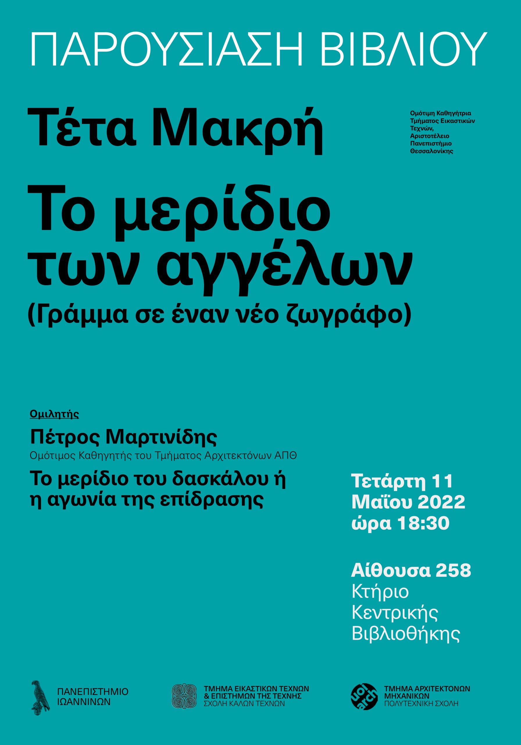 Παρουσίαση του βιβλίου της κ. Τέτας Μακρή, Ομότιμης Καθηγήτριας του Τμήματος Εικαστικών Τεχνών του ΑΠΘ, Το μερίδιο των αγγέλων (Γράμματα σε έναν νέο ζωγράφο), εκδ. Μελάνι, 2021.
